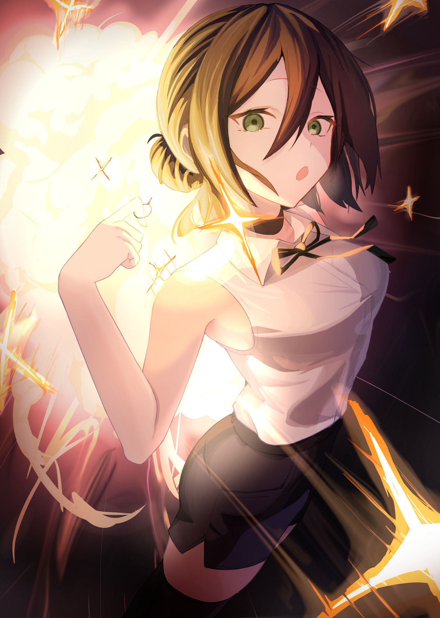 1girlblack chokerblack hairblack ribbonblack thighhighschokerexplosiongreen eyesgrenade pinhair between eyeshair bunlooking at viewerneck ribbonopen mouthribbonshirtshirt tucked insleevelesssleeveless shirtsolothighhighsuser frkc2572white shirt