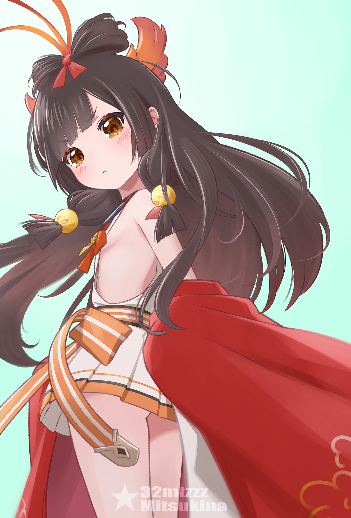 kikyo168, satsuki rin, embodiment of scarlet devil, touhou, silver hair, 1girl, ahoge, expressionless, female focus, grey eyes, hair ornament, long hair, simple background, solo, very long hair, wide sleeves