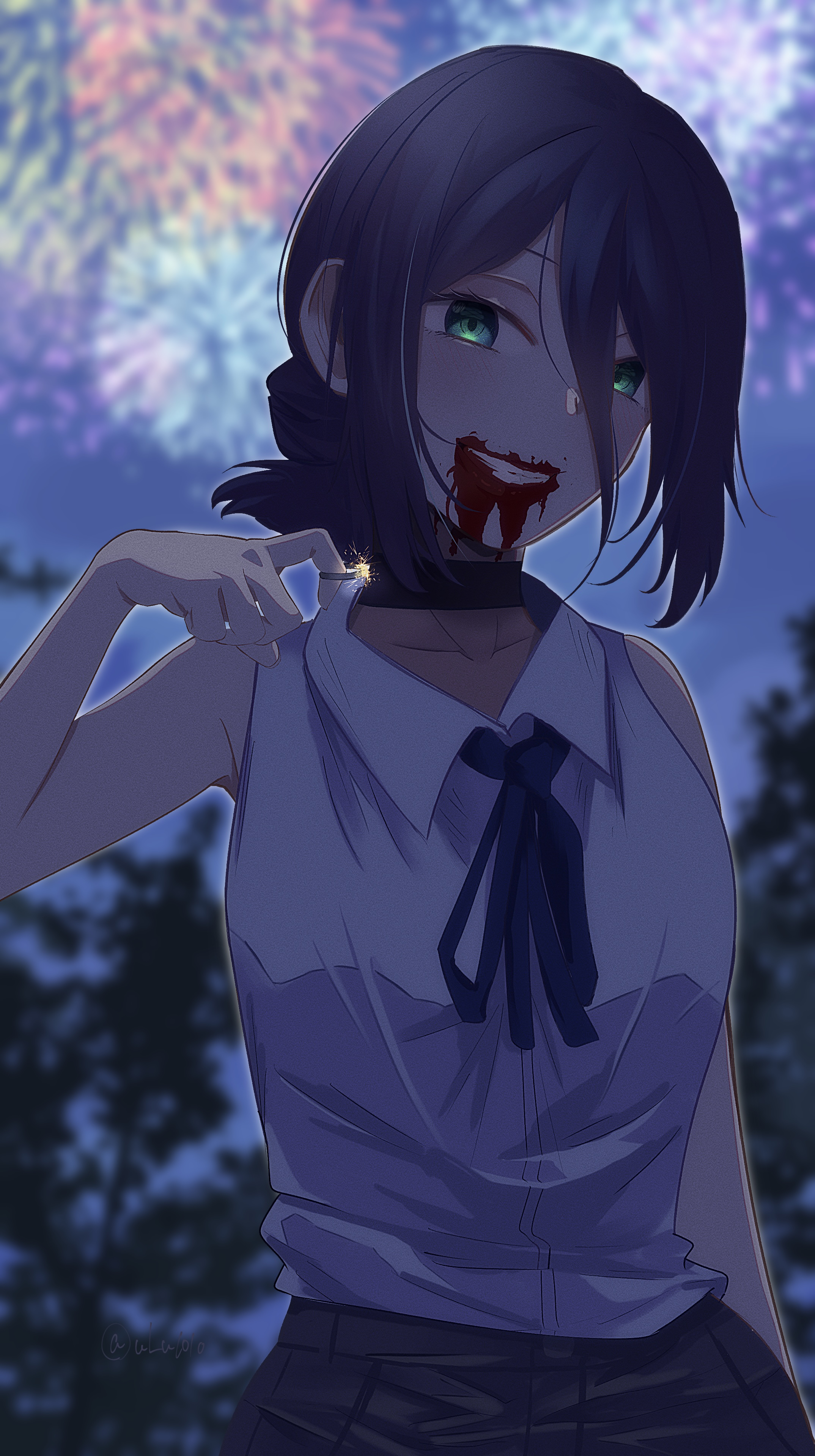 1girlaerial fireworksblack chokerblack hairblack ribbonbloodblood from mouthblurryblurry backgroundchokerfireworksgreen eyesgrey shirthair between eyeslooking at viewerneck ribbonnightoutdoorsribbonshirtshirt tucked insleevelesssleeveless shirtsolotreetwitter usernameulu1010