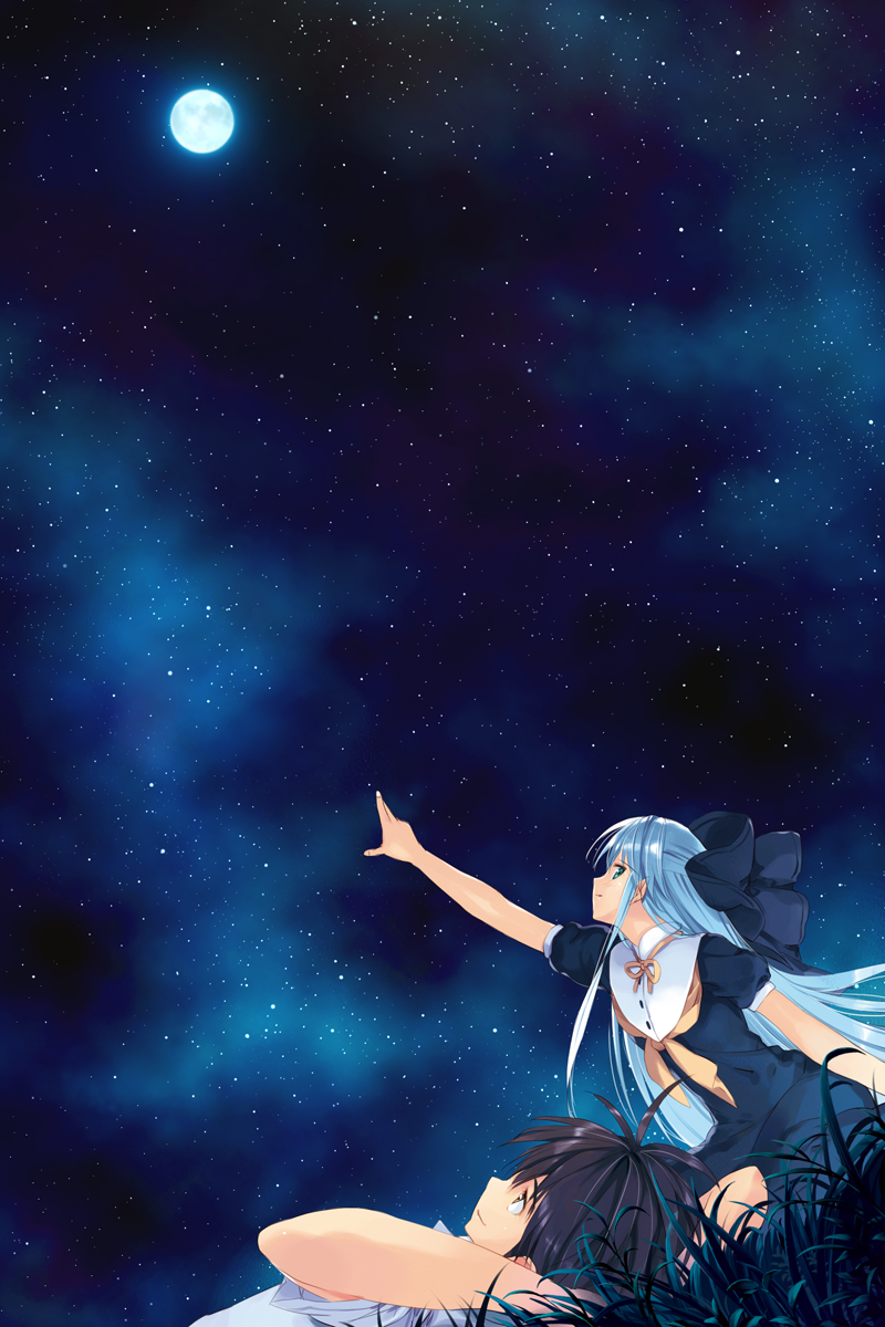 1girlblue hairbowfemale focusgrasshair bowmoonnightnight skypointingskysolostar (sky)star (symbol)starry sky