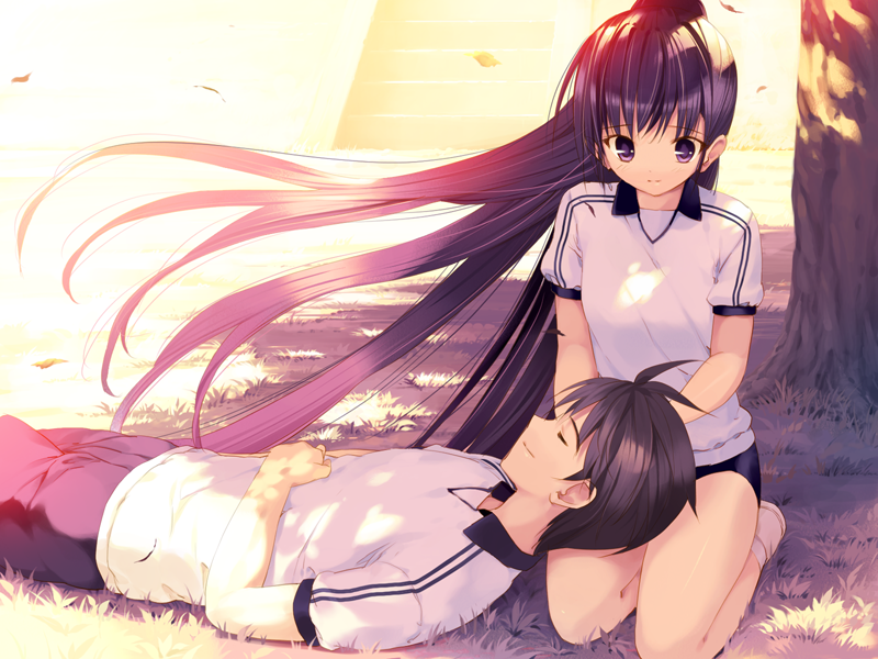 1boy1girlclosed eyesfloating hairgym uniformlap pillowlong hairpurple eyesseizasittingtree shadevery long hairwind
