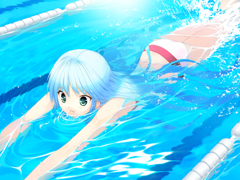1girlaqua hairbikiniblue hairfemale focusgreen eyeslane linepoolsolosplashingswimmingswimsuitwater