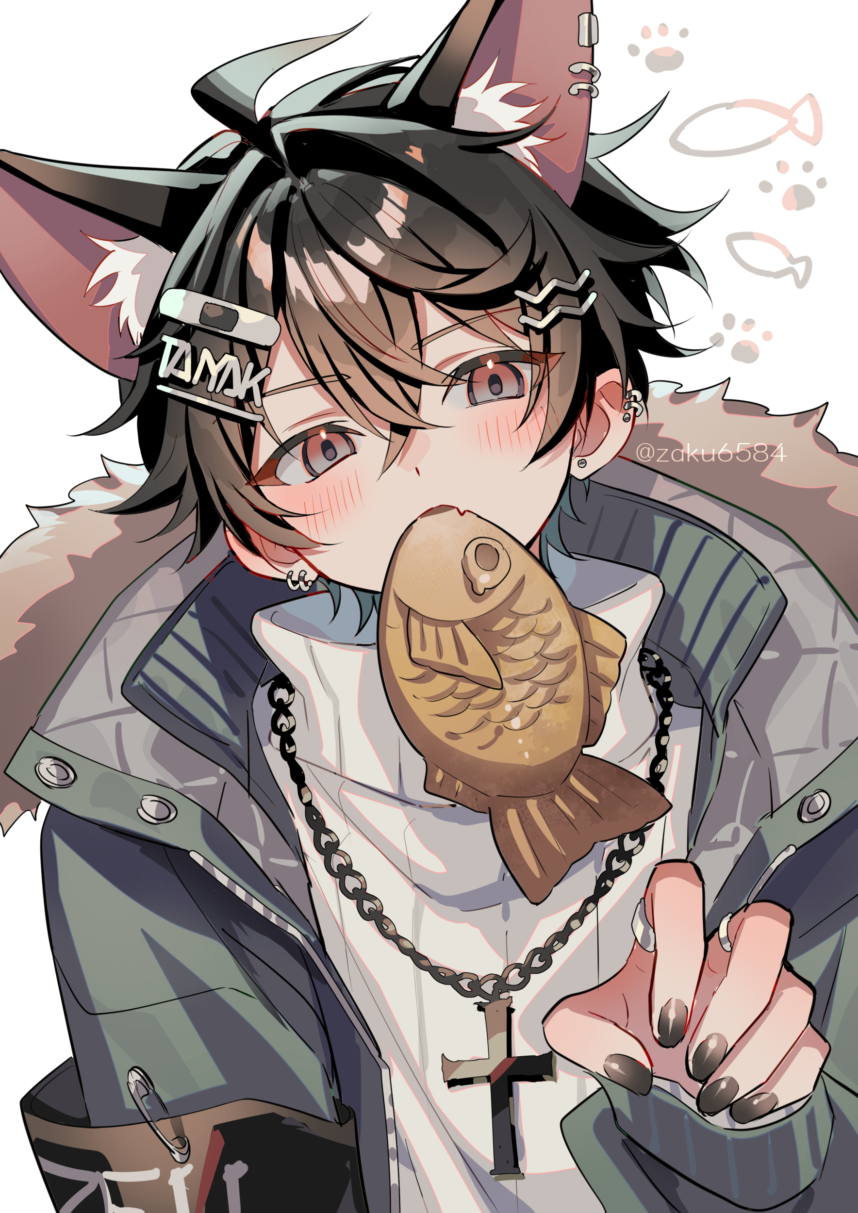 1boyahogeanimal ear fluffanimal earsblack hairblack nailsblushcat boycat earscat tailcrosscross necklacedouble-parted bangsear piercingfangfoodfood in mouthgreen jackethair between eyeshand upjacketjewelrylong sleeveslooking at viewermale focusnail polishnecklaceopen clothesopen jacketpiercingred eyesribbed sweatershort hairsimple backgroundskin fangsolosweatertailtaiyakiturtleneckturtleneck sweatertwitter usernameupper bodywagashiwhite backgroundwhite sweater