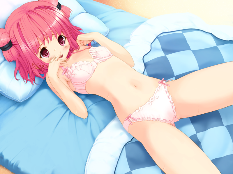 1girlbedblushbraembarrassedeye contactfemale focusflat chesthand on own cheekhand on own facelingerielooking at anotherlyingnarrow waiston bedpantiespillowpink eyespink hairribbonribbon trimribbon-trimmed underwearsolostomachunderwearunderwear only