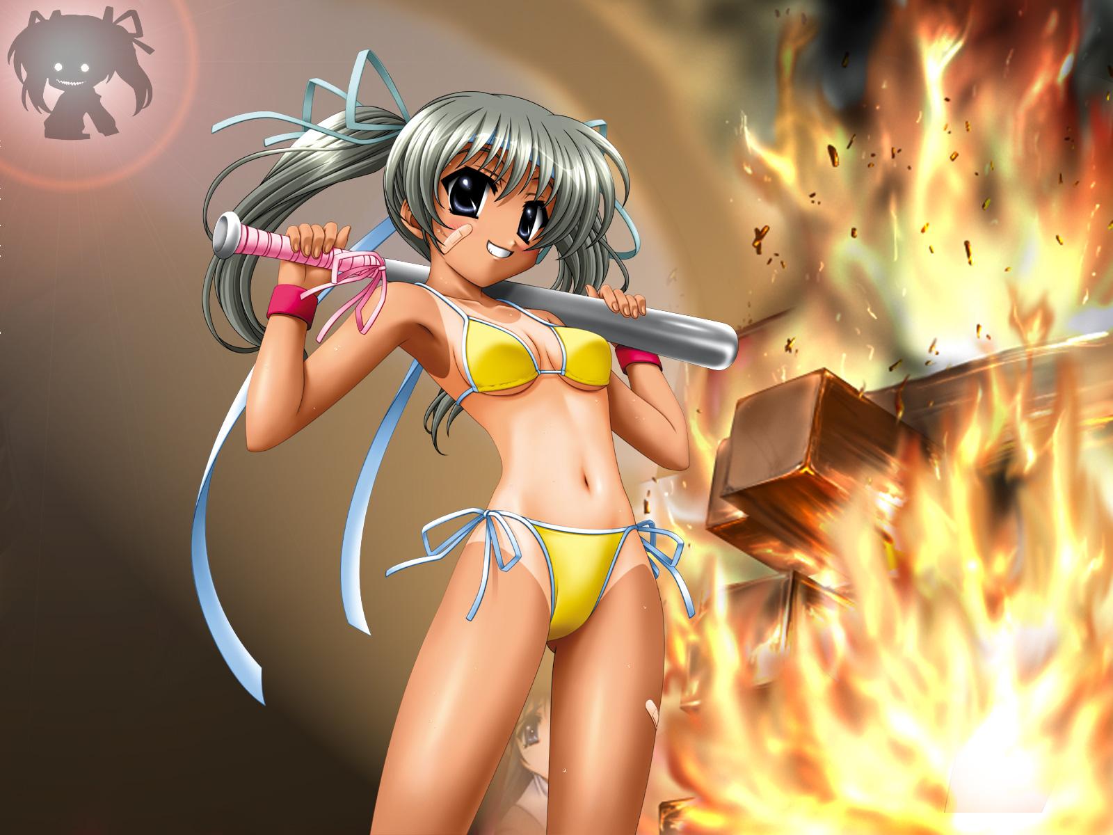 2girlsbandaidbandaid on facebaseball batbikiniblue eyesbonfirebreastscleavagecowboy shotfireglowingglowing eyesgrinhair ribbonlong hairmultiple girlsnavelone-piece tanover shoulderribbonshiny skinside-tie bikini bottomsmall breastssmilesolo focusstring bikiniswimsuittantanlinetwintailsunderboobyellow bikini