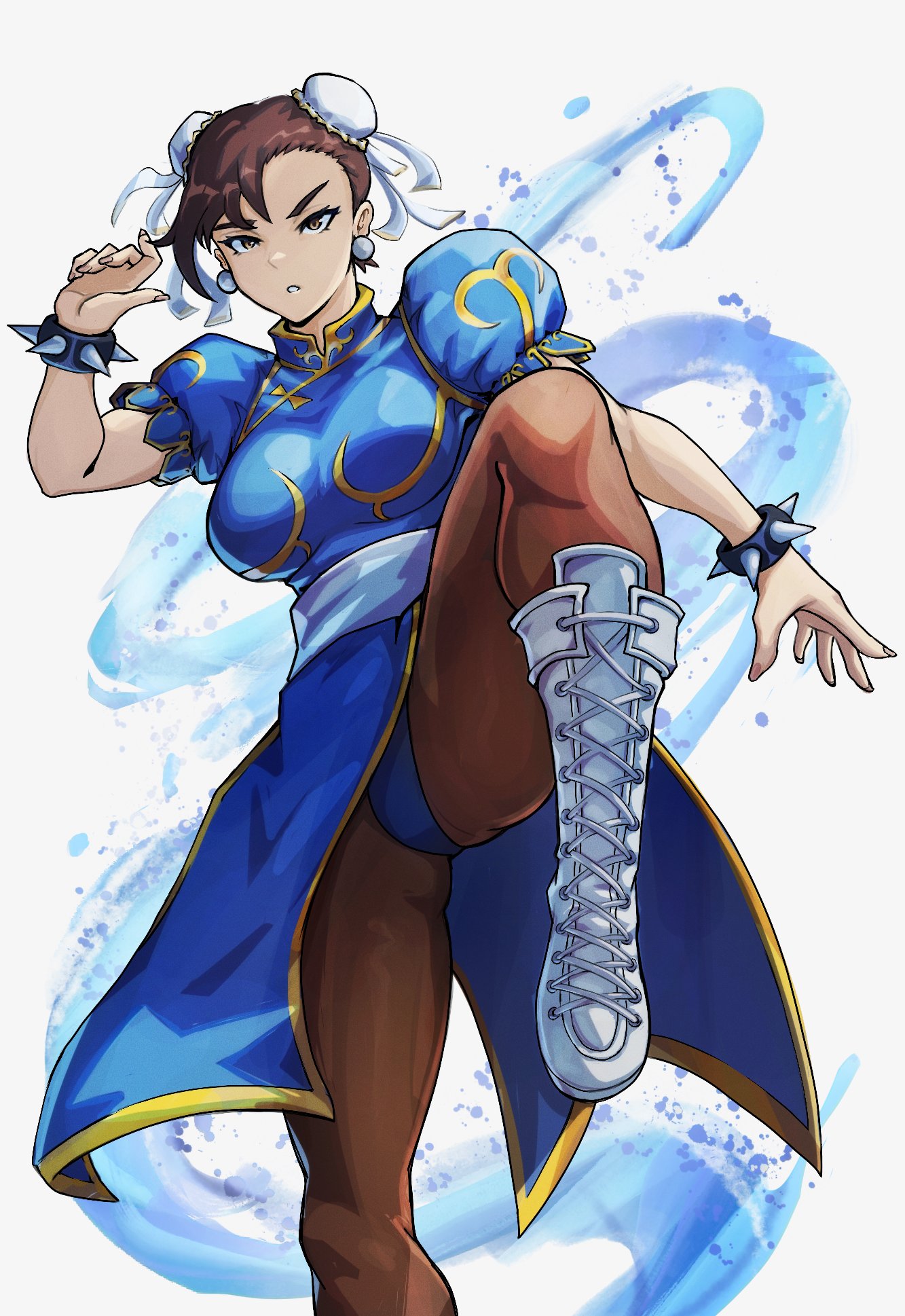 1girlbangleblue dressbootsbraceletbreastsbrown hairbrown pantyhosebun coverchina dresschinese clothesdouble bundressfighting stancehair bunhigh kickjewelrykickinglace-up bootslooking at viewermedium breastspantyhosesashsolospiked braceletspikesthick thighsthighswhite bootswhite sash