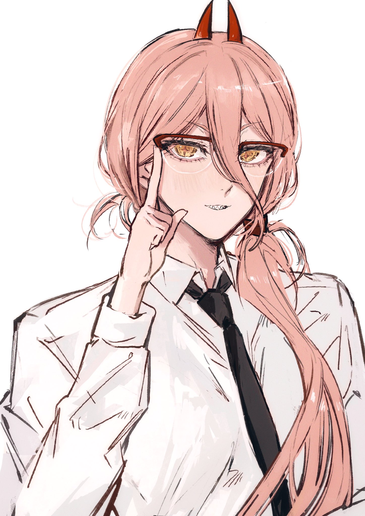 1girlblack necktiedemon girldemon hornsglasseshair between eyeshornsindex finger raisedlong hairlong hair between eyeslooking at viewernecktiepink hairred hornsred-framed eyewearsemi-rimless eyewearsharp teethshirtsimple backgroundsoloteethwhite backgroundwhite shirtyellow eyes