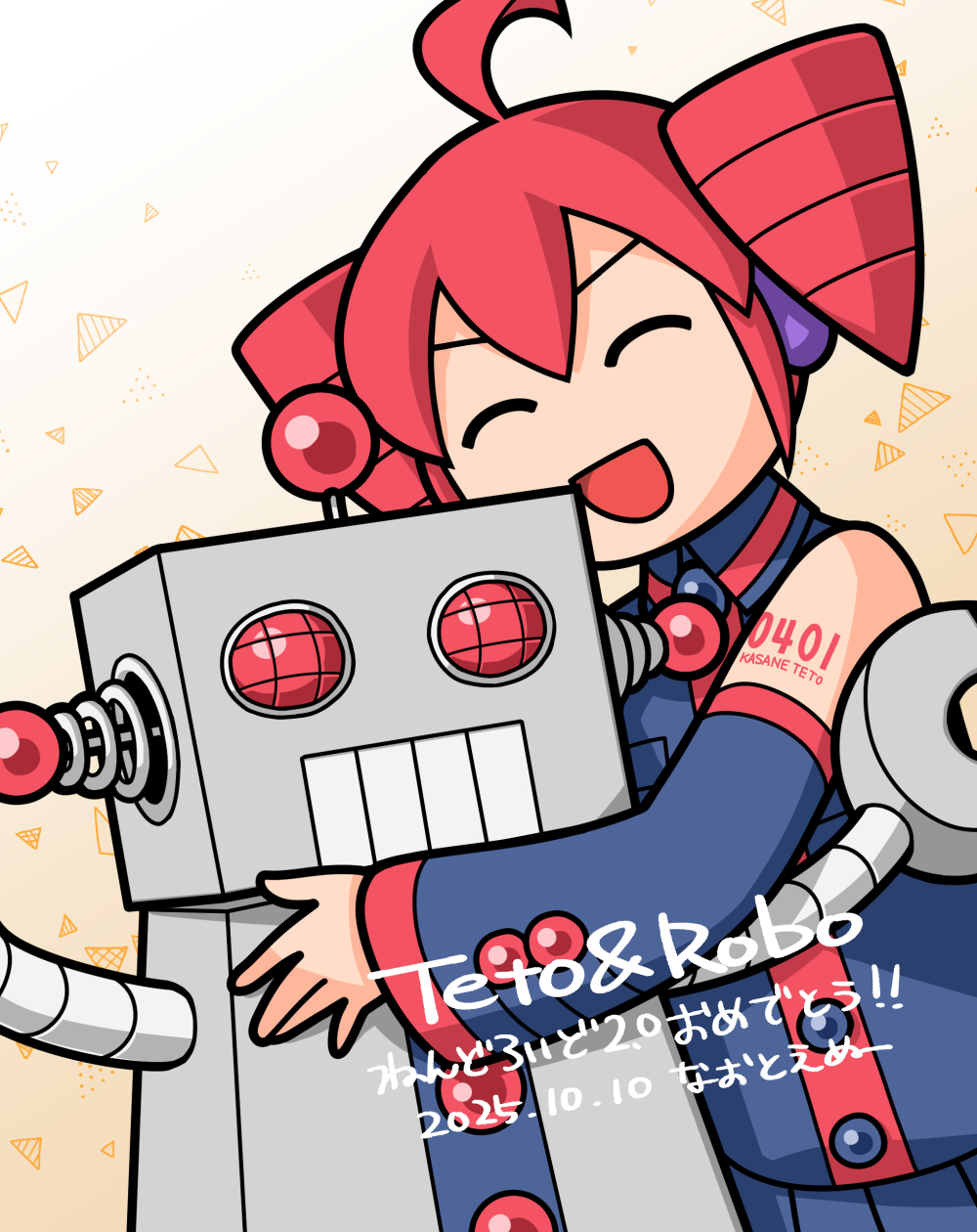 :d1boy1girlahogearm tattooblack outlineblue shirtblue sleevesclosed eyescollared shirtdetached sleevesdrill hairgradient backgroundhair between eyeshuglong sleevesopen mouthoutlinered hairrobotshirtsleevelesssleeveless shirtsmilesolotattootimestamptriangletwin drills