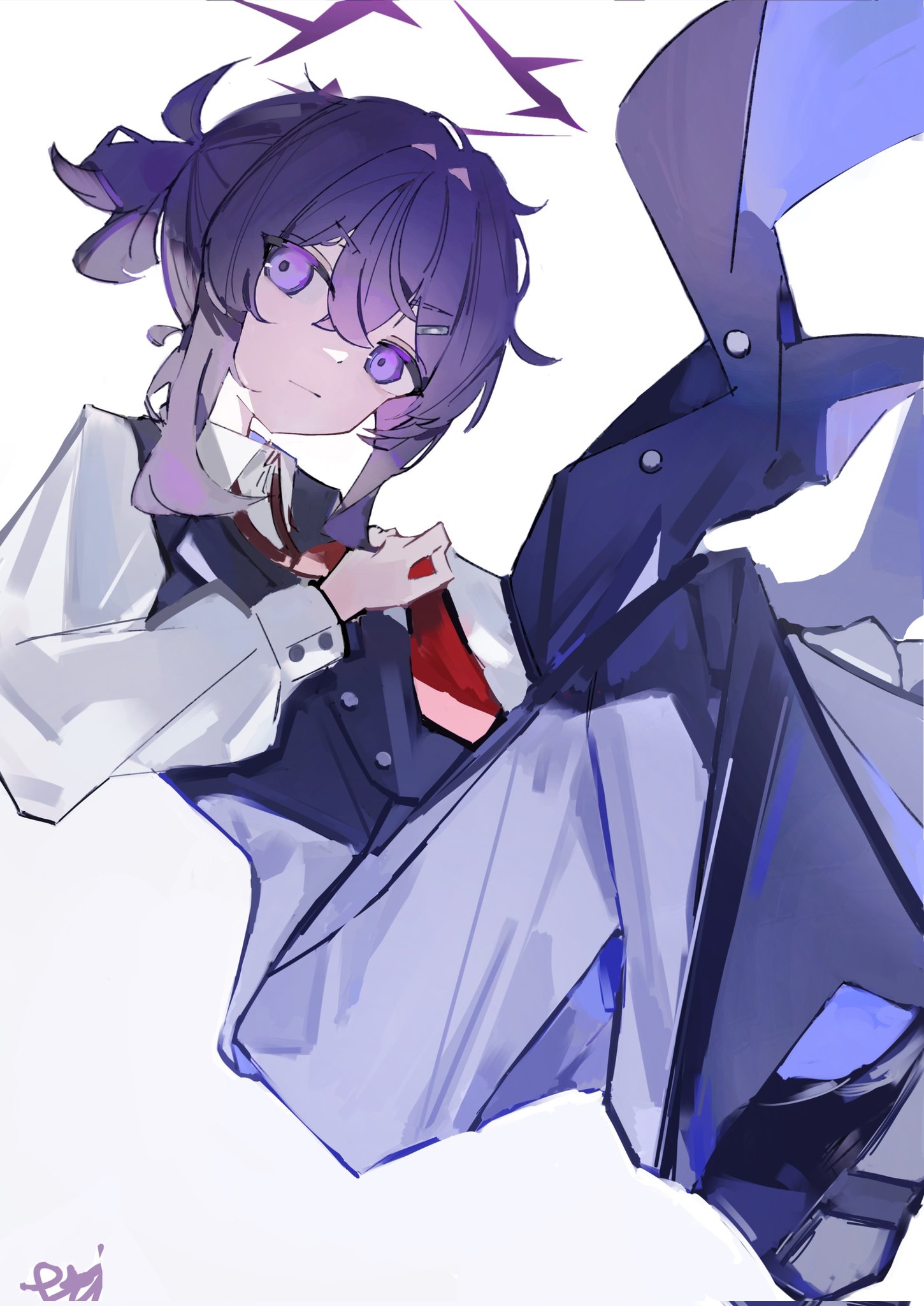 1girlblack vestclosed mouthcollared shirthair between eyeshair ornamenthaircliphalolong sleeveslooking at viewernecktiepantspurple eyespurple hairpurple halored necktieshirtsignaturesimple backgroundsolovestwhite backgroundwhite shirtwrdij5w0rg31830