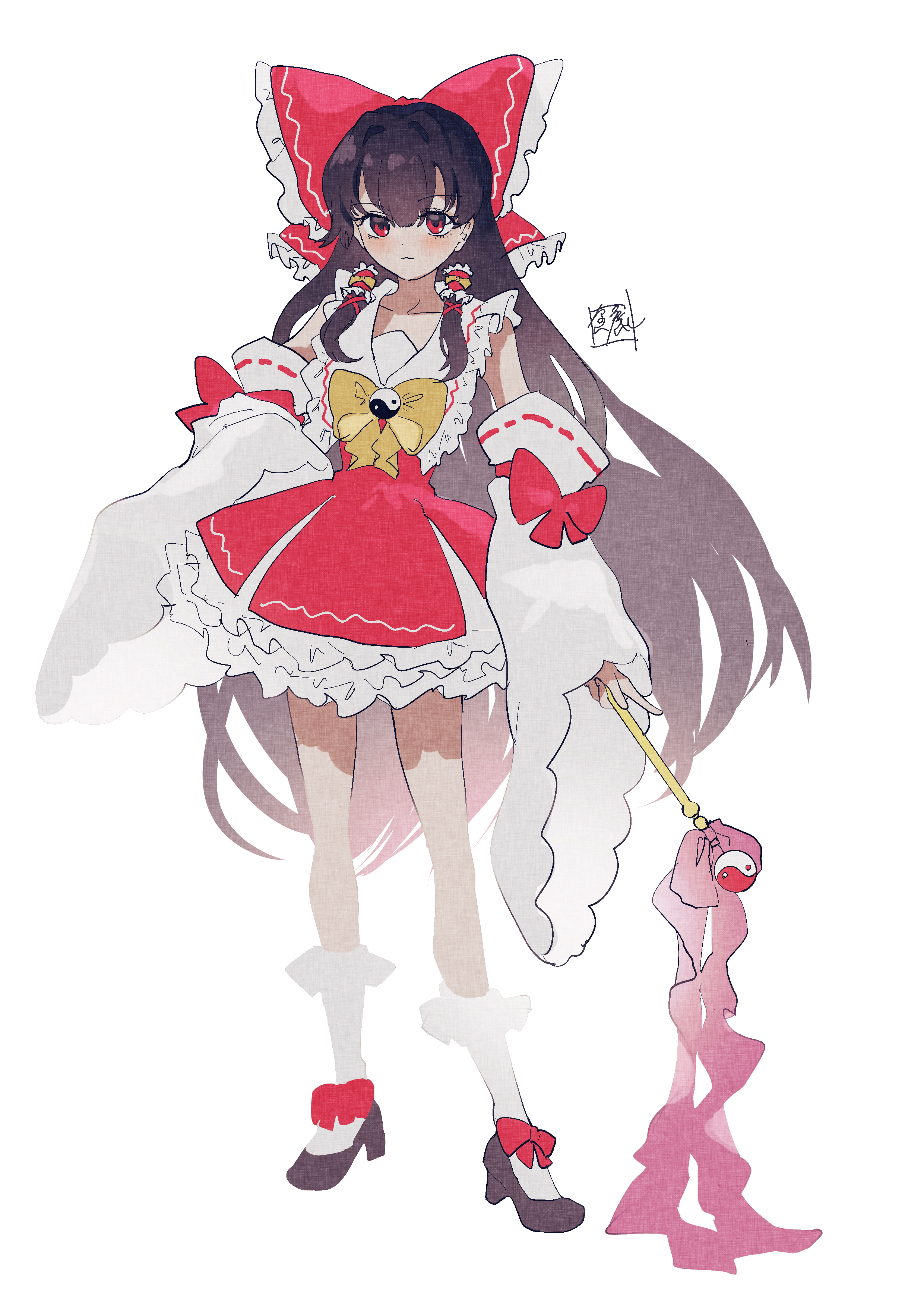 1boy1girlbare shouldersblack hairblack shirtblushbobby socksbowbowtieclosed mouthcollarbonedetached sleevesdressfrilled bowfrillsgoheihair bowhair tubeshigh heelsholdingholding goheilong hairlong sleevesred bowred dressshirtsidelockssimple backgroundsleevelesssleeveless shirtsockssolovery long hairwhite backgroundwhite socksyellow bowyellow bowtieyin yang