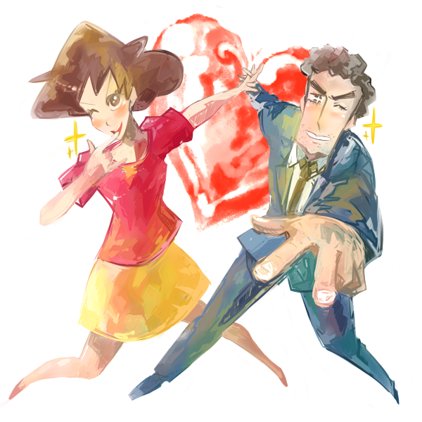 1boy1girlblushbrown haircasualcouplefinger to mouthforeshorteningformal clotheshappyheartheterointerlocked fingerslong hairlooking at viewermature femaleone eye closedshirtshort hairsimple backgroundskirtsmilesparklesuitt-shirtwhite backgroundwink