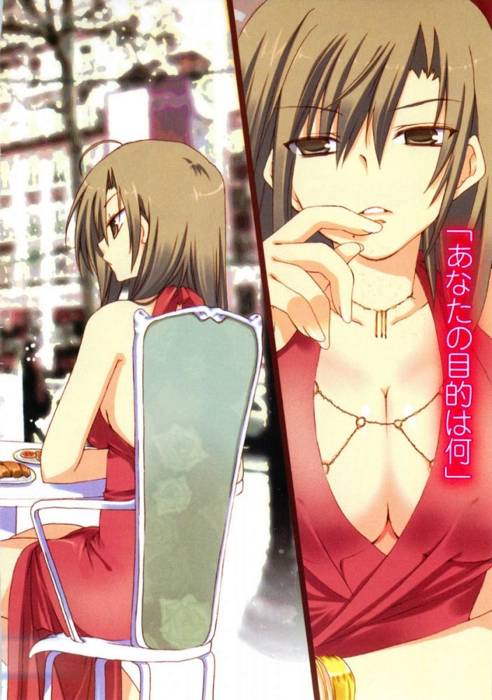 kanzaki ryouko, milky galactic universe, milky subway, highres, 1girl, bodysuit, brown eyes, brown hair, collared shirt, copyright name, helmet, long hair, looking down, low-tied long hair, necktie, paper, pencil skirt, shirt, simple background, sitting, skirt, table, yellow background, yokoshima (daredayo 003)