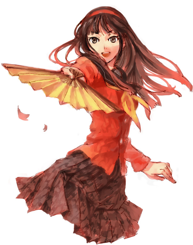 1girlblack eyesblack haircardigancherry blossomsfemale focusfolding fanhairbandhand fanhoundstoothschool uniformskirtsmilesoloteeth