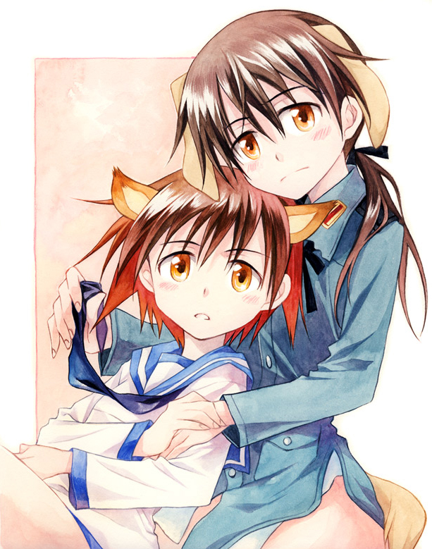 00s2girlsanimal earsbrown eyesbrown hairholding handslong hairmultiple girlspantiesponytailschool uniformserafukushort hairunderwearyuri
