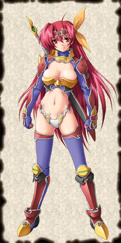 1girlahogearmorbikini armorbreastscircletcleavagefemale focushair ribbonlong hairred eyesred hairribbonsolostandingthighhighs