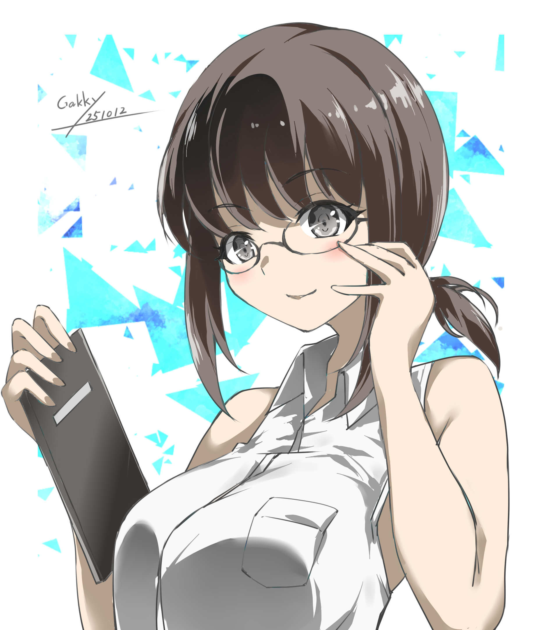 1girlalternate breast size (larger)bespectacledblack hairclipboardcollared shirtdress shirtglassesgrey eyeslow ponytailponytailshirtsidelockssleevelesssleeveless shirtsmilesoloupper bodywhite shirt