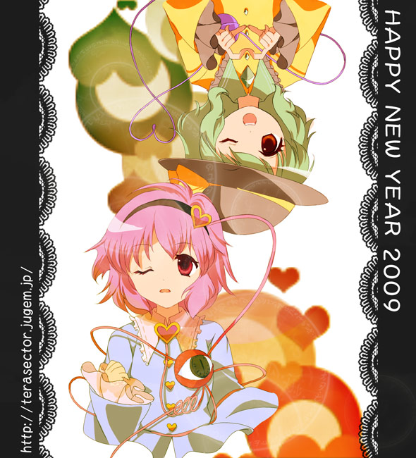 2girlsfemale focusgreen hairhairbandhatlooking at viewermultiple girlspink hairshort hairsiblingssimple backgroundsistersstringthird eyewhite background