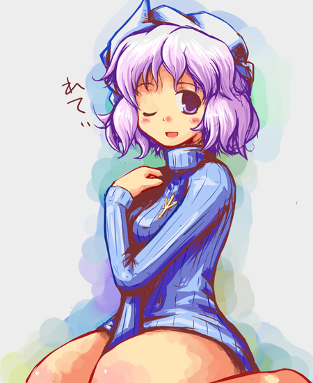 :d1girlbare legsblushcasualfemale focuslooking at viewerno pantsone eye closedopen mouthparted lipssimple backgroundsmilesolosweaterthighswhite background