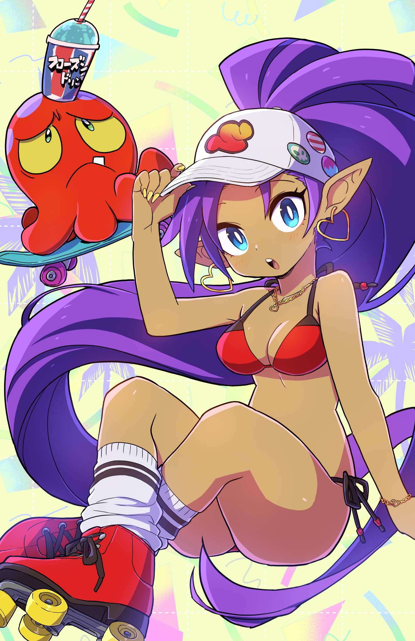 :o1girl1otherbare shouldersbaseball capbikiniblue eyesbreastscleavagecupdark skindark-skinned femaledisposable cupdrinkdrinking strawearringshathigh ponytailjewelrylong hairlooking at viewermedium breastsnail polishnecklaceopen mouthpointy earsponytailpurple hairred bikiniroller skatessittingskateboardskateboardingskatessocksswimsuitvery long hairwhite socks