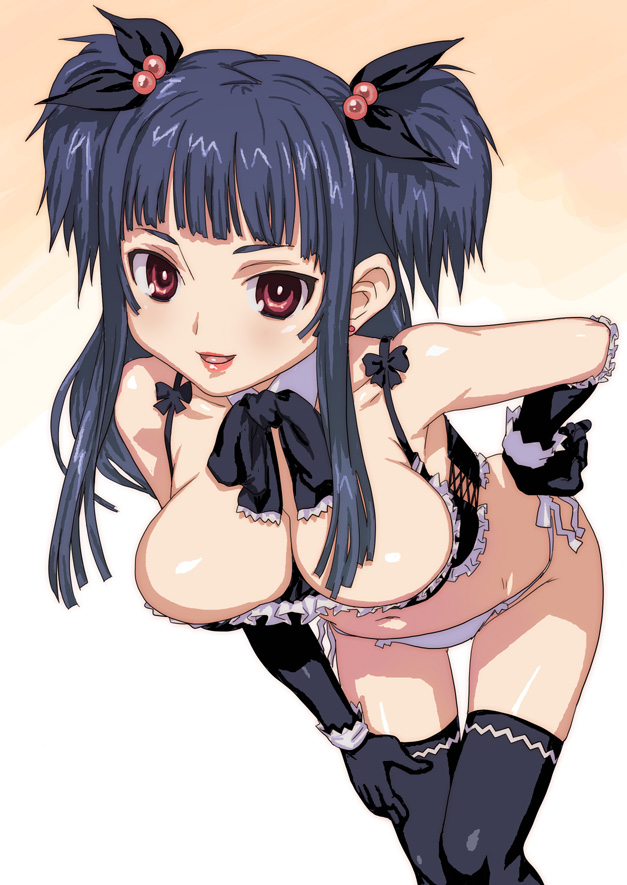 1girlblue hairbreastsbursting breastscleavagedownblouseearringselbow glovesfemale focusglovesjewelrylarge breastsleaning forwardlipslipsticklong hairmakeupopen mouthpantiesred eyesside-tie pantiessmilesolothighhighsunderwearwhite panties