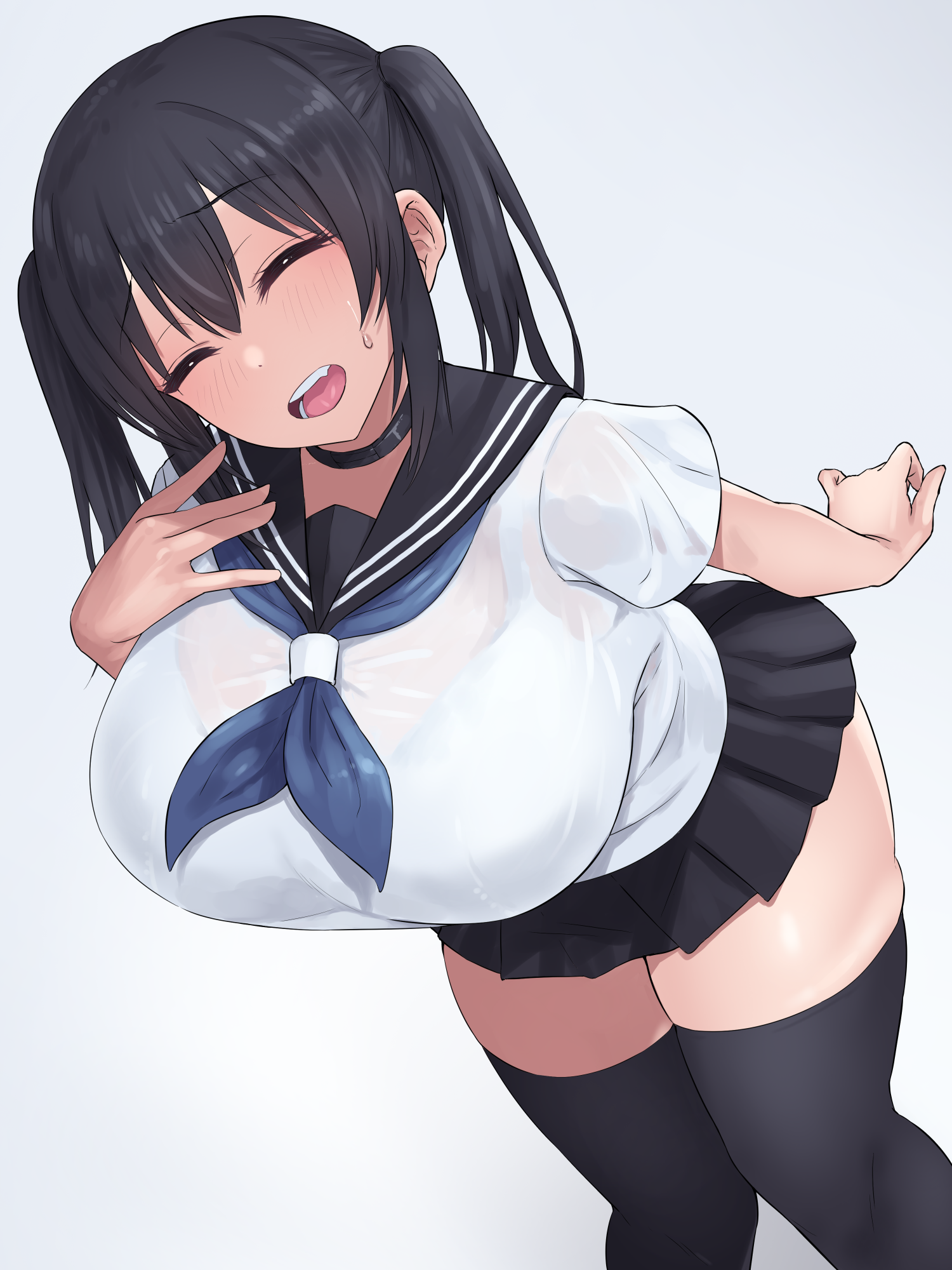 1girlblack eyesblack hairblack sailor collarblack skirtblack thighhighsblushbowbrabra visible through clothesbreastsclosed eyesgrey backgroundhair bowlarge breastslooking at vieweropen mouthsailor collarschool uniformshirtshort sleevessidelockssimple backgroundskirtsmilesolostandingteeththighhighstwintailsunderwearwhite brawhite shirt