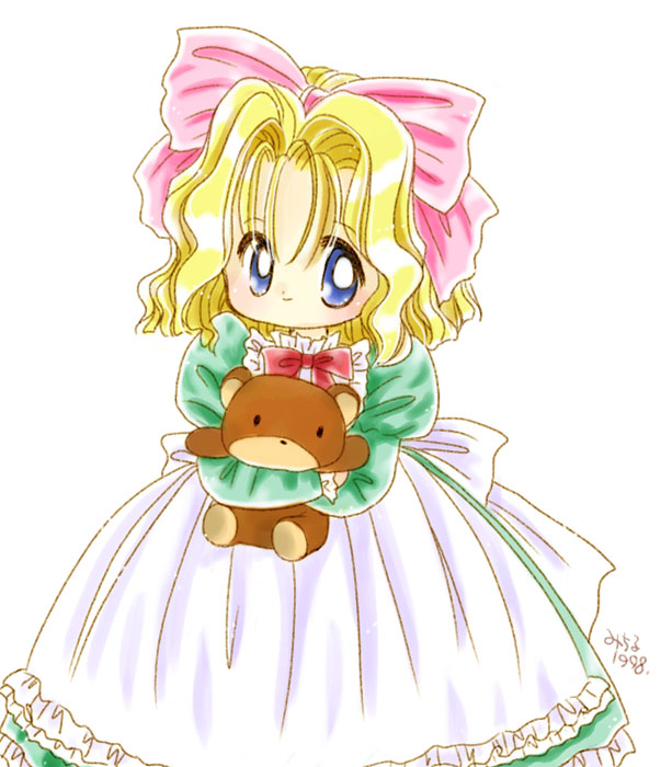 00s1990s (style)19981girlblonde hairblue eyesblushbowdressfemale focuslooking at viewerpink bowretro artstyleshort hairsimple backgroundsmilesolostuffed animalstuffed toyteddy bearwhite background