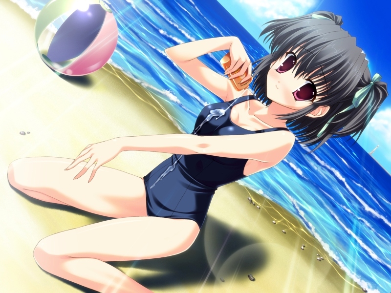 1girlballbeachbeachballblack hairdaydutch anglefemale focuskneelinglotionone-piece swimsuitred eyesschool swimsuitshort hairsolosuggestive fluidsunscreenswimsuittwintails