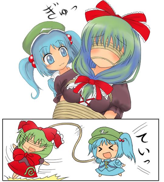 susukinohukurou, arch bishop (ragnarok online), baphomet jr, sorcerer (ragnarok online), ragnarok online, commentary request, 2boys, :3, argyle clothes, argyle shirt, bags under eyes, baphomet jr (cosplay), bell, black gloves, blue eyes, brown horns, brown pants, closed eyes, closed mouth, cosplay, cowboy shot, crescent, gauze, gauze on cheek, gloves, goat costume, grey hair, headpat, holding, holding scythe, horns, looking at another, male focus, multiple boys, pants, scythe, shirt, short hair, smile, star (symbol), white shirt