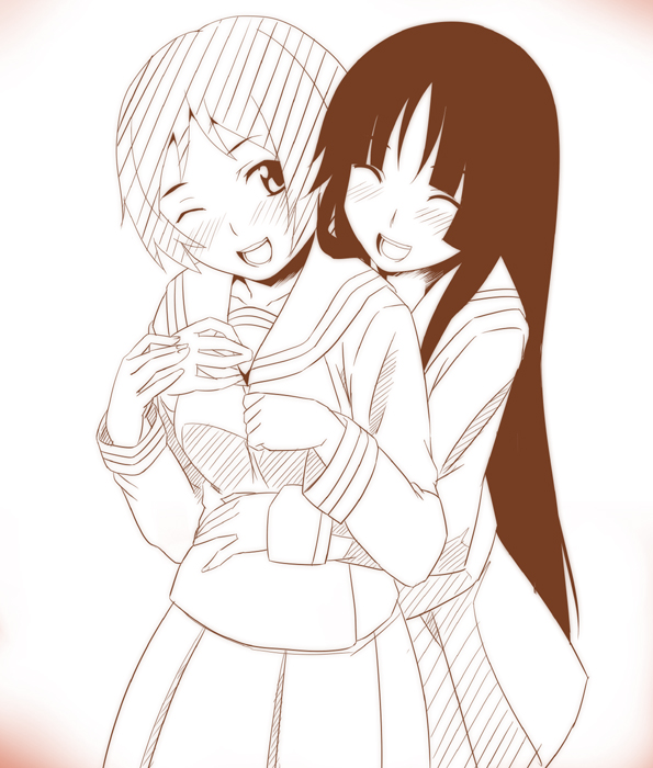 niina ryou, gertrud barkhorn, strike witches, world witches series, bad id, bad pixiv id, translated, 00s, 1girl, alternate costume, brown hair, female focus, gradient background, hair ornament, hair ribbon, ribbon, school uniform, serafuku, smile, solo, twintails, yellow eyes