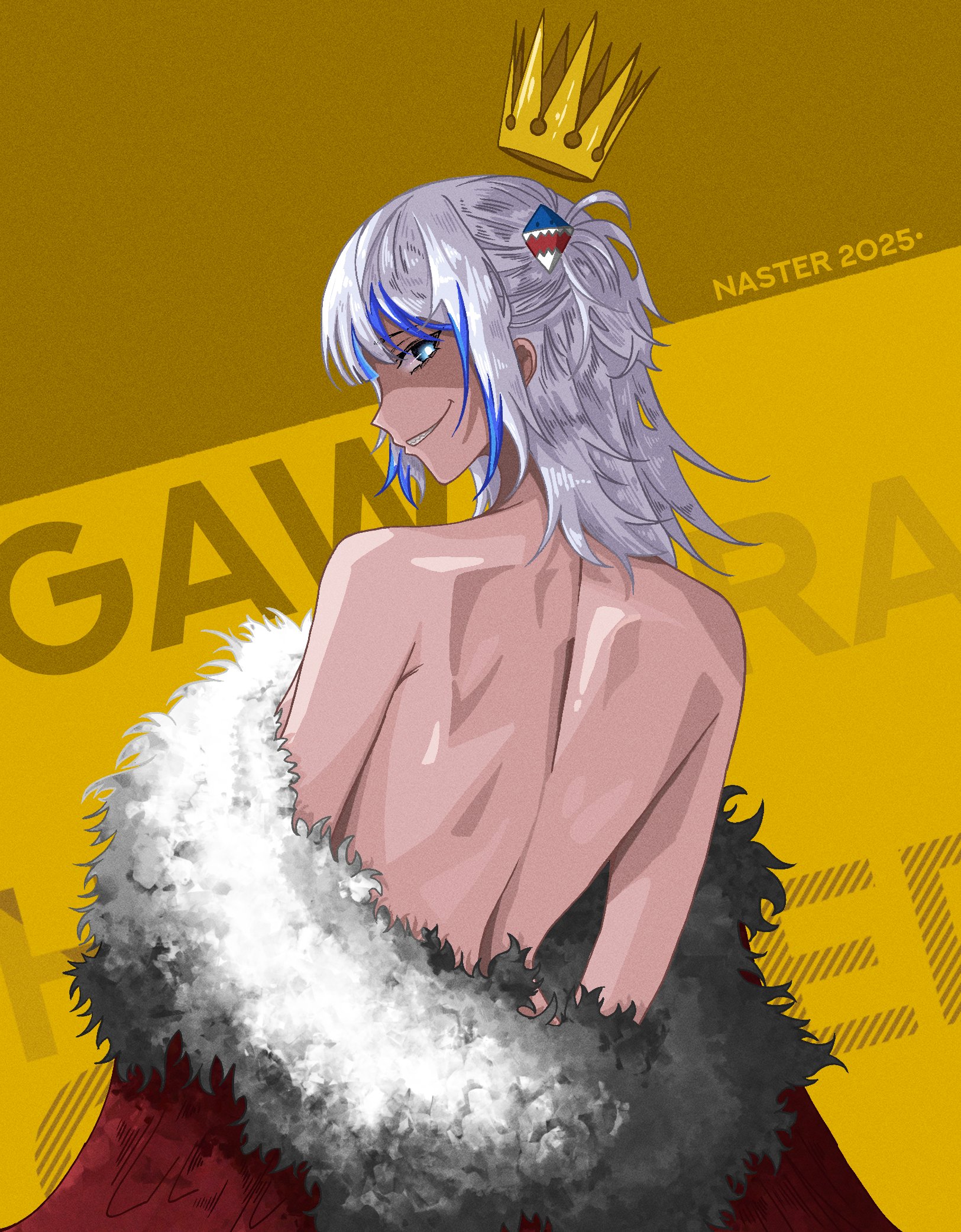 1girlalternate costumebare shouldersblue eyesblue haircrownfrom behindgrinhair ornamentlooking backmedium hairmulticolored hairno brarobeshark hair ornamentsmilesolostreaked hairvirtual youtuberwhite hair
