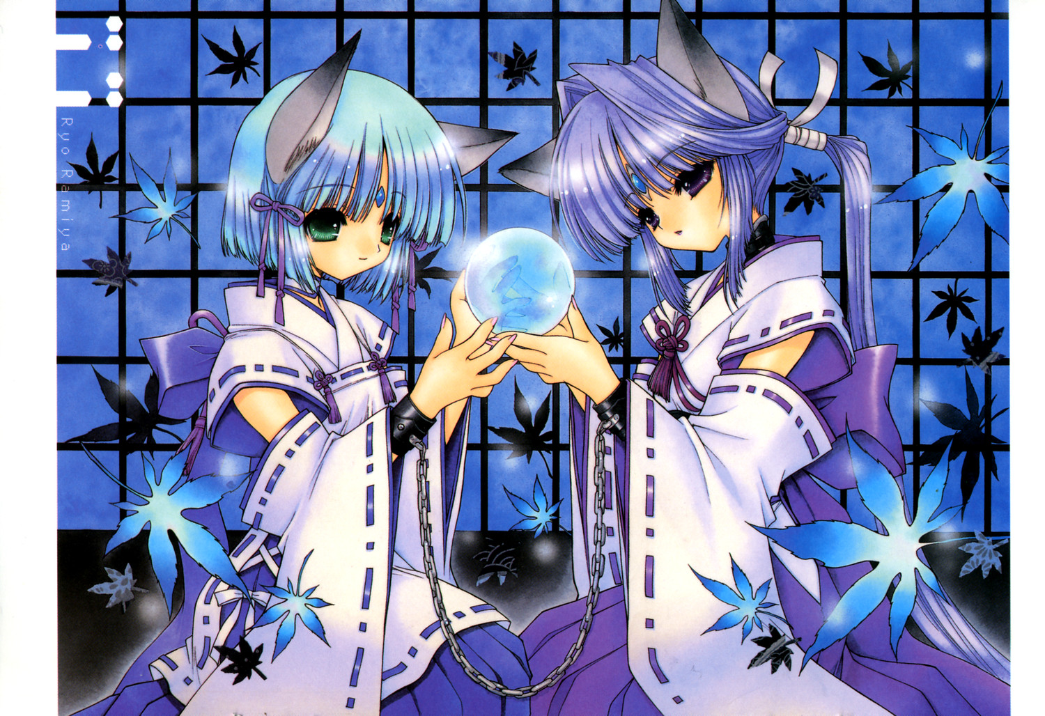 animal earsblue hairblue themegreen eyeshakamahakama skirtjapanese clothesleaflong hairmikoponytailpurple eyespurple hairshort hairsittingskirtvery long hair