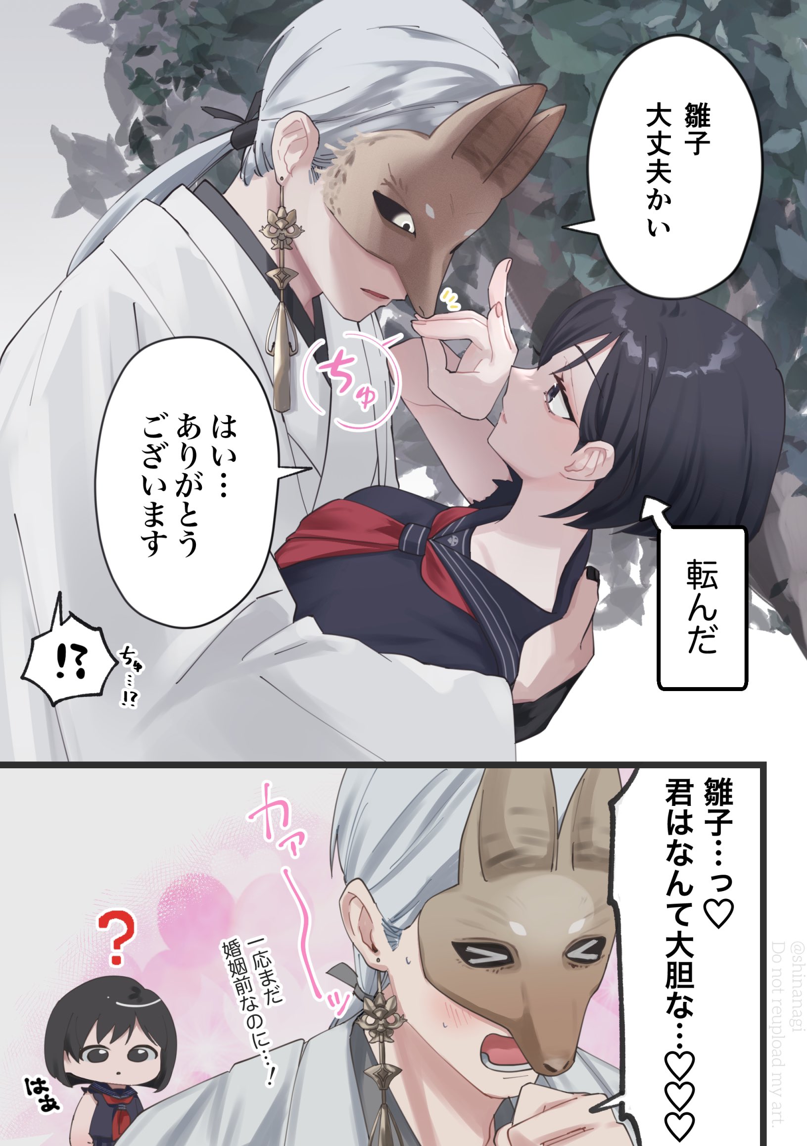 ssd h2p7, hanamura yousuke, narukami yu, persona, persona 4, highres, bag, bottle, brown hair, buttons, chopsticks, closed eyes, eating, food, fruit, grey hair, holding, holding chopsticks, holding food, jacket, lemon, lemon slice, open clothes, open jacket, shirt, short hair, sitting, twitter username, white shirt