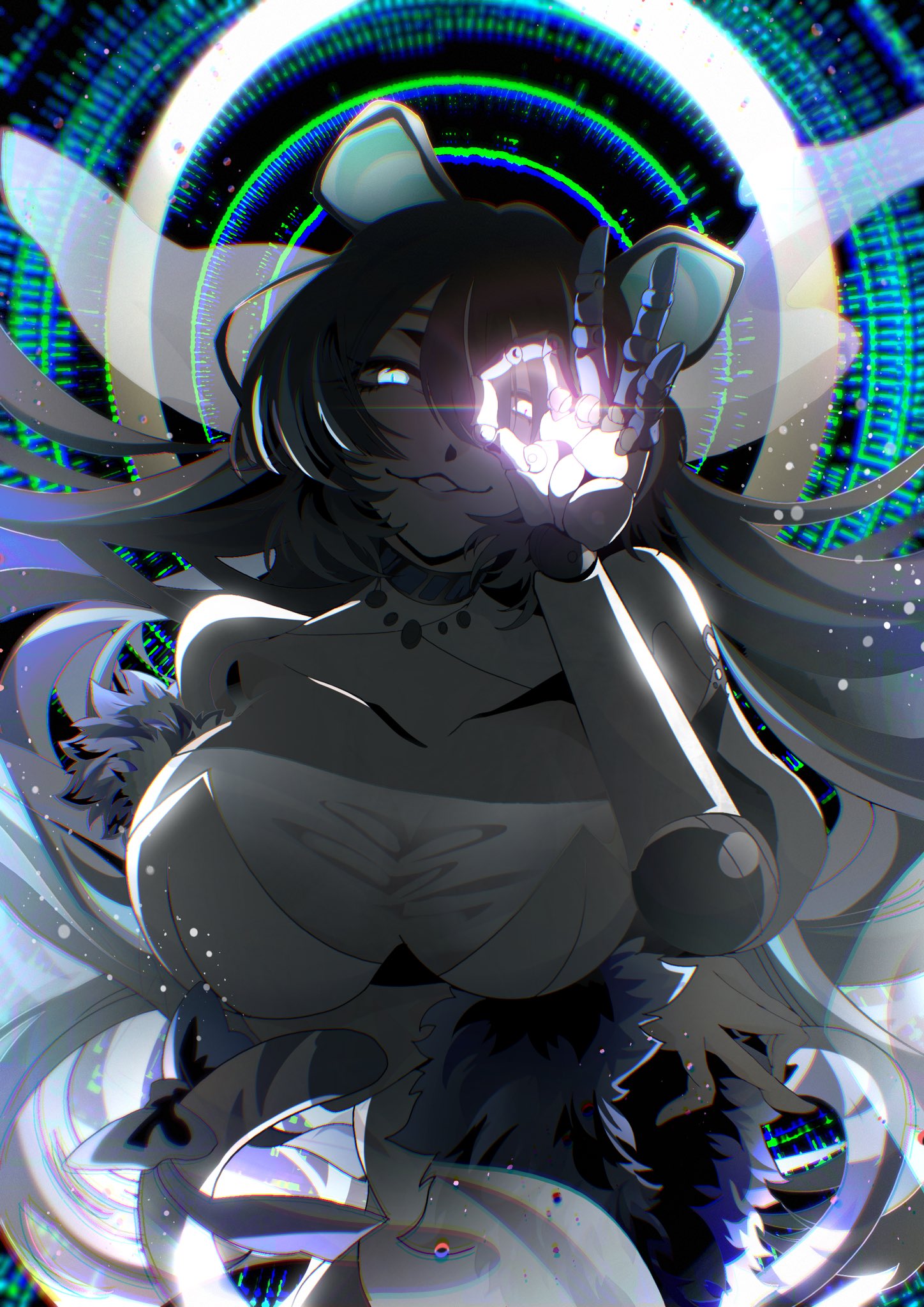 1girlanimal earsblack hairblue eyesblue hairbowbreastsfur trimfur-trimmed sleeveshair over one eyelarge breastslong hairmechanical armsmulticolored hairsingle mechanical armsolostreaked hairtailtail bowtail ornamenttaut clothestiger earstiger tailvirtual youtuber