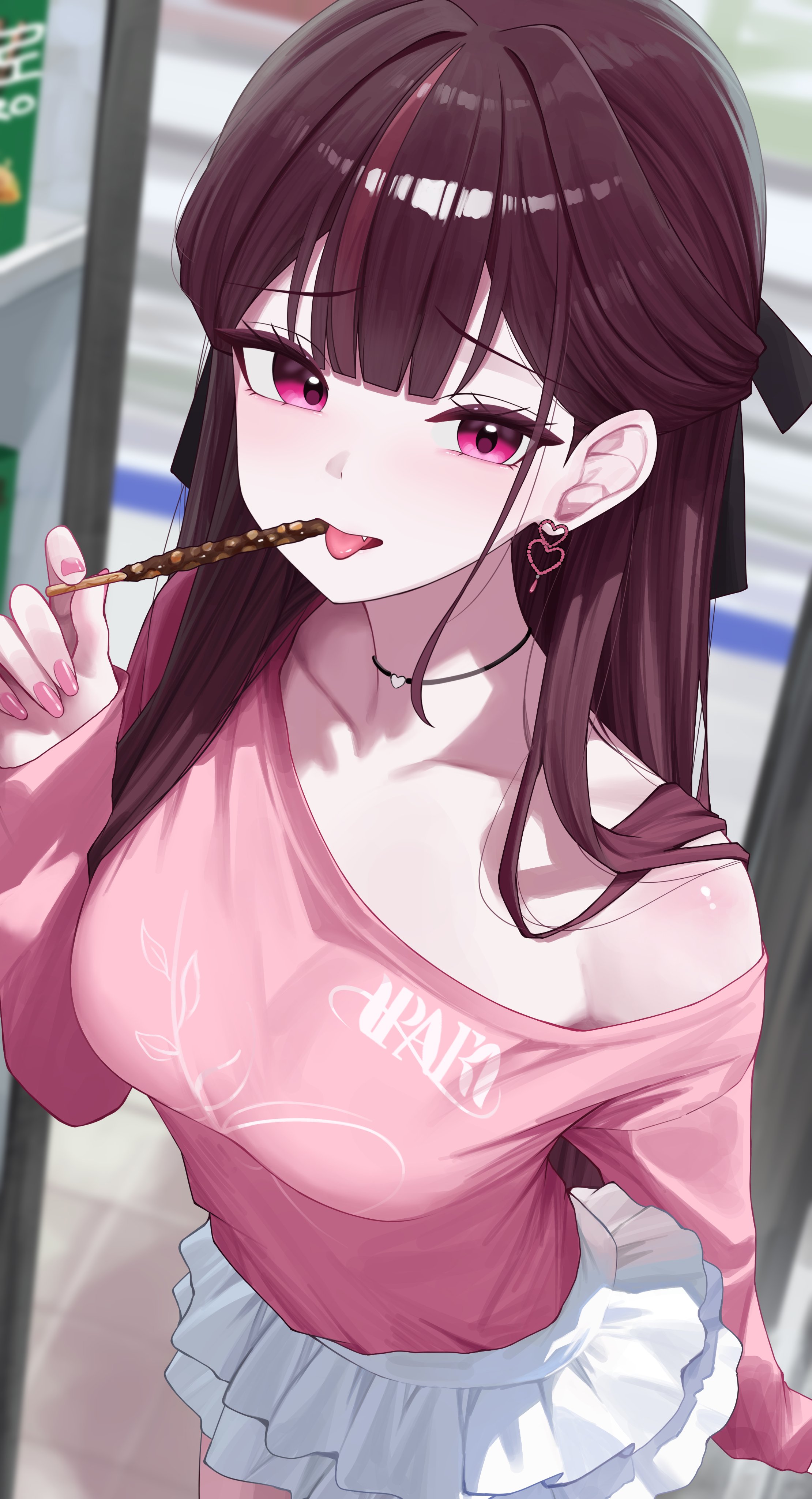 1girlbare shouldersblack chokerblurryblurry backgroundbreastschokercowboy shotearringsfangfoodhair ribbonhalf updohand upheartheart earringsholdingjewelrylayered skirtlong hairlong sleeveslooking at viewermedium breastsminiskirtmulticolored hairnail polishoff shoulderopen mouthpink nailspink shirtpockypurple eyespurple hairribbonshirtskirtsolostandingstreaked hairtonguetongue outvirtual youtuberwhite skirt