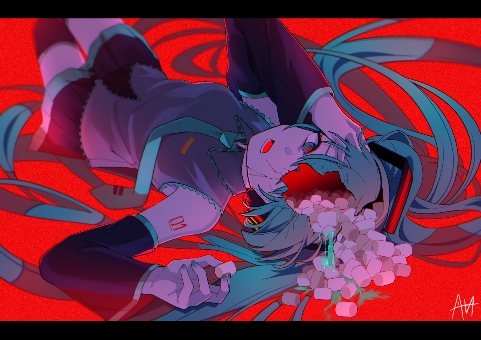 1girlabsurdly long hairambiguous green liquidblack skirtblack sleevesblack thighhighscracked skindetached sleevesfeet out of framefoodgreen eyesgreen hairgreen necktiegrey shirthand on own headhand uphollow bodyletterboxedlong hairlyingmarshmallowmarshmallow (vocaloid)necktienumber tattooon backopen mouthred backgroundred pupilsshirtshoulder tattoosignaturesimple backgroundskirtsolotattoothighhighsvery long hair