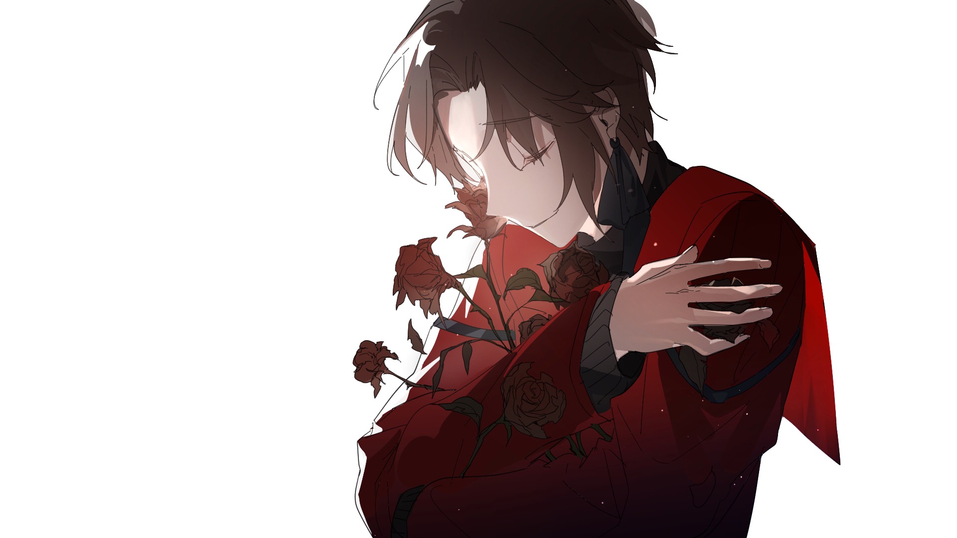 aotsuki eito, sumino takumi, the hundred line -last defense academy-, absurdres, chinese commentary, highres, 2boys, ahoge, armband, black boots, black pants, black streaks, boots, closed eyes, flower, gakuran, geta, glasses, gloves, grey hair, growing out of body, holding hands, last defense academy school uniform, male focus, mizongwenwu, multicolored hair, multiple boys, pants, red hair, school uniform, scroll, short hair, smile, streaked hair, sunglasses, white armband, white gloves, yaoi