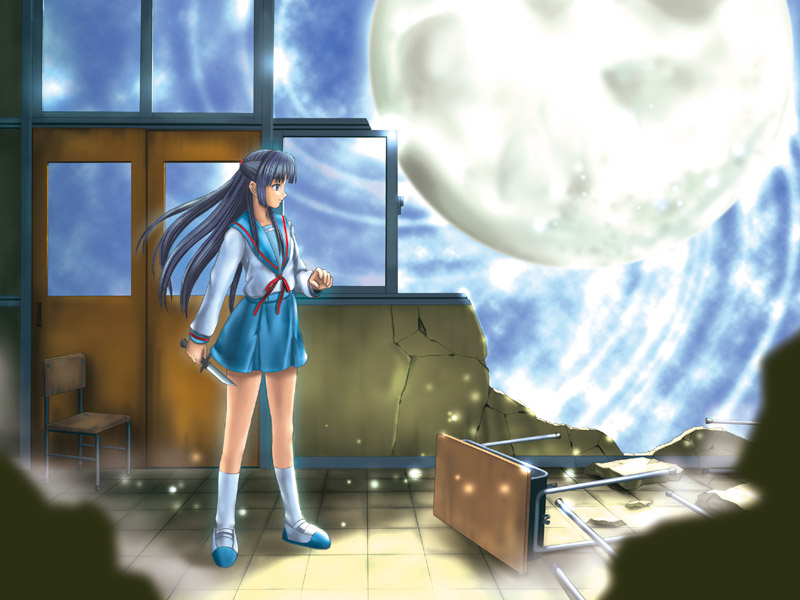 00sblue eyesblue hairclassroomcollateral damageknifelong hairmoonschoolschool uniformserafukusolo