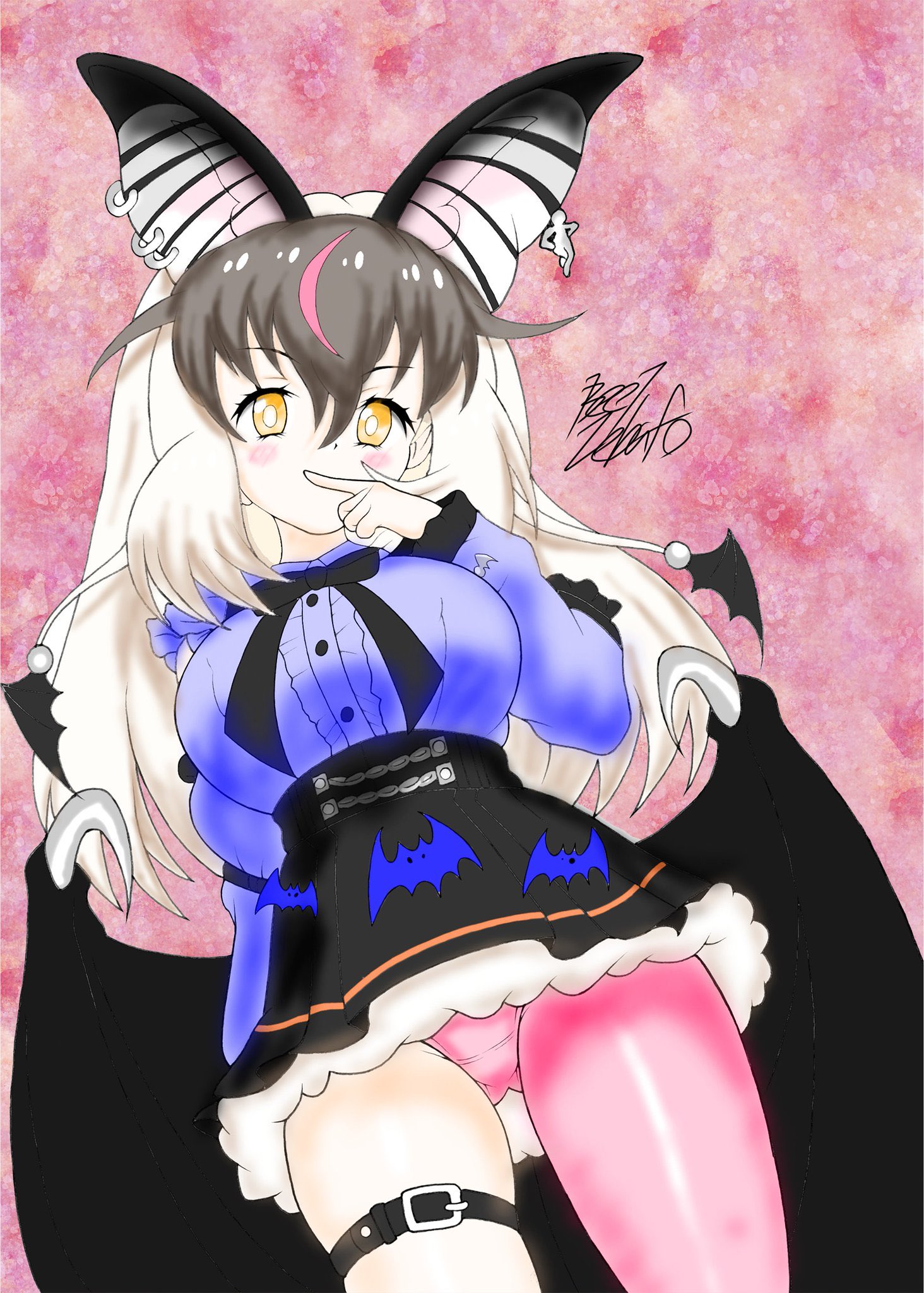 1girlanimal earsbat earsbat girlbat wingsbeltbrown eyesbrown hairdressearringsextra earsgrey hairjewelrylong hairlooking at viewermulticolored hairneck ribbonpantiespantyhosepink backgroundribbonshirtsimple backgroundskirtsolostreaked hairunderwearvirtual youtuberwings