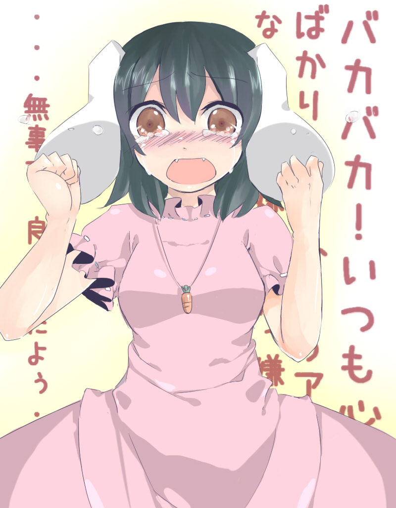 1girlanimal earsblack hairblushbrown eyesdressfangsfemale focusjewelrypendantrabbit earsshort hairsolotearstsundere