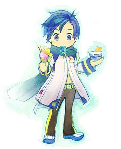 1boyblue eyesblue hairchibicloakeatingfoodfull bodygradient backgroundice creammale focusmatching hair/eyesmouth holdscarfshort hairsimple backgroundsolostanding