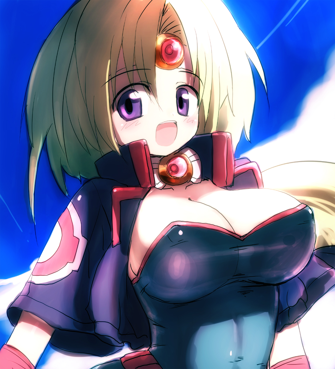 1990s (style)1girlblonde hairbreastscircletcleavageclouddayfemale focusforehead jewelheadbandlarge breastspurple eyesretro artstyleskysmilesolo