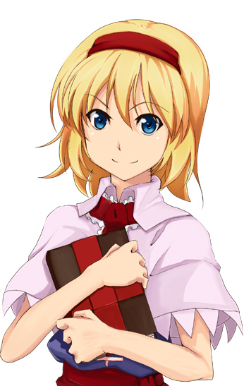 1girlblonde hairblue eyesbookfemale focusgrimoiregrimoire of alicehairbandsolowhite background
