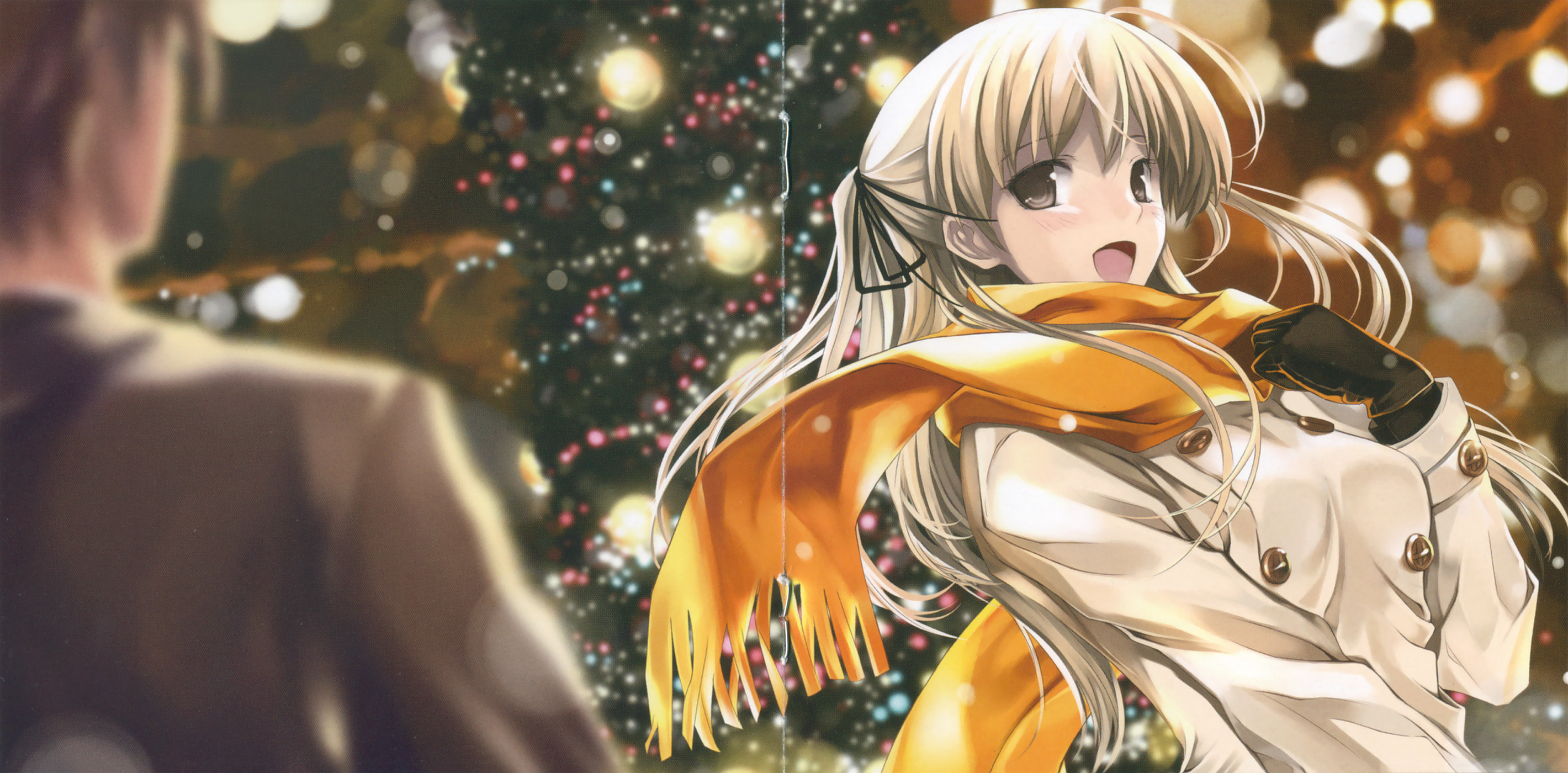 1boy1girlblonde hairblurryblushbrown eyeschristmas treecoverdepth of fieldgloveslong hairorange scarfscarf