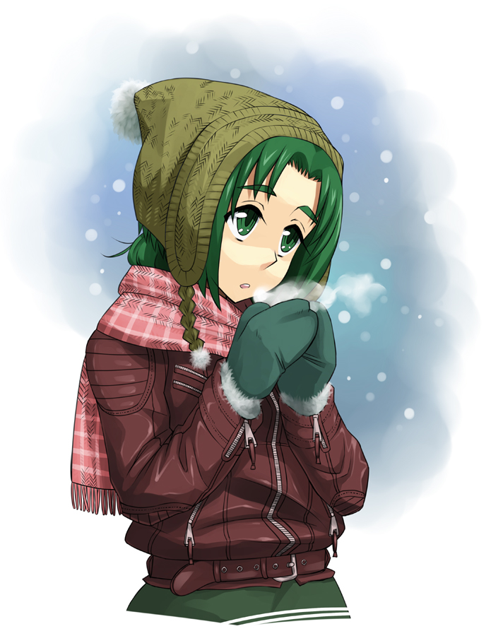 00s1girlbeaniebreathearflap hatfemale focusglovesgreen eyesgreen hairhathat pompomjacketleatherleather jacketleatherjacketmatching hair/eyesmittensplaid clothesplaid scarfscarfsnowsolowinterwinter clotheszipper