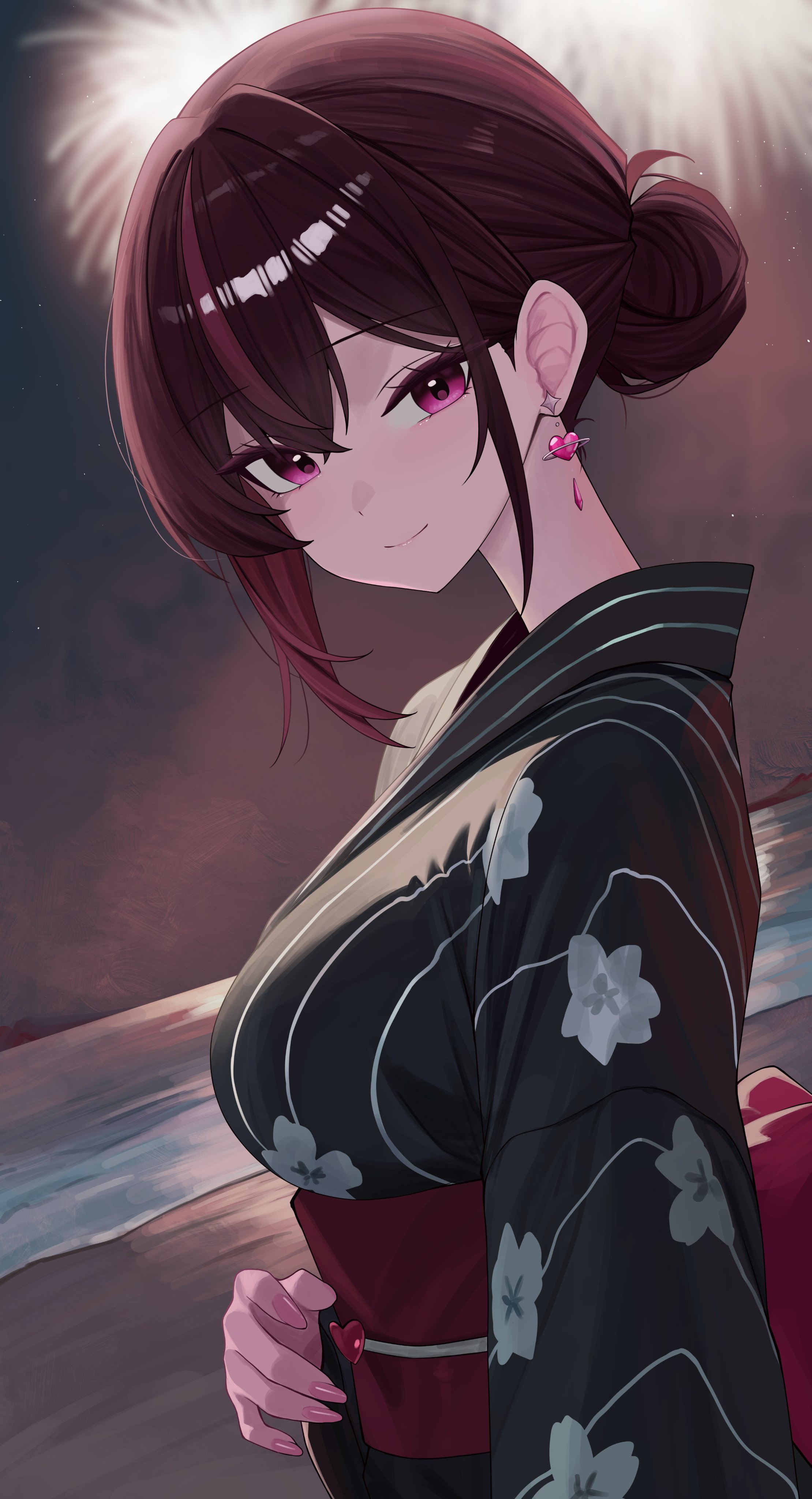 1girlaerial fireworksbacklightingbeachblack kimonoclosed mouthdutch angleearringsfireworksfrom sidehair bunjapanese clothesjewelrykimonolong hairlong sleeveslooking at viewermulticolored hairobipurple eyespurple hairsashsidelockssmilesolostreaked hairupper bodyvirtual youtuberyukata