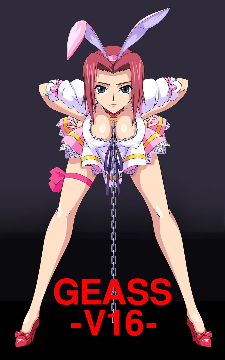 1girlakira (viper) (cosplay)animal earsblue eyesbreastsbreasts apartchaincleavagecollarcosplaycovered erect nipplesdownblousefake animal earsfemale focushands on own hipshanging breastshigh heelslarge breastsrabbit earsred hairshoesshort hairsolowaitress