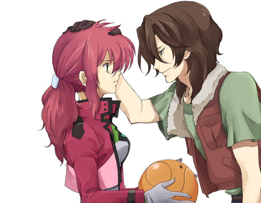 makuramuika, hero (dq4), pisaro, dragon quest, dragon quest iv, 2boys, ahoge, black jacket, boots, brown boots, cup, forehead protector, full body, green hair, green tunic, grey hair, in container, in cup, jacket, long bangs, looking at another, male focus, multiple boys, own hands together, pants, parted bangs, parted lips, pointy ears, red background, red eyes, shirt, stuck, sweatdrop, tunic, upper body, white pants, white shirt, winged headwear