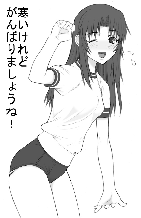 1girlburumafemale focusgreyscalegym uniformlong hairmonochromeone eye closedsimple backgroundsolowink