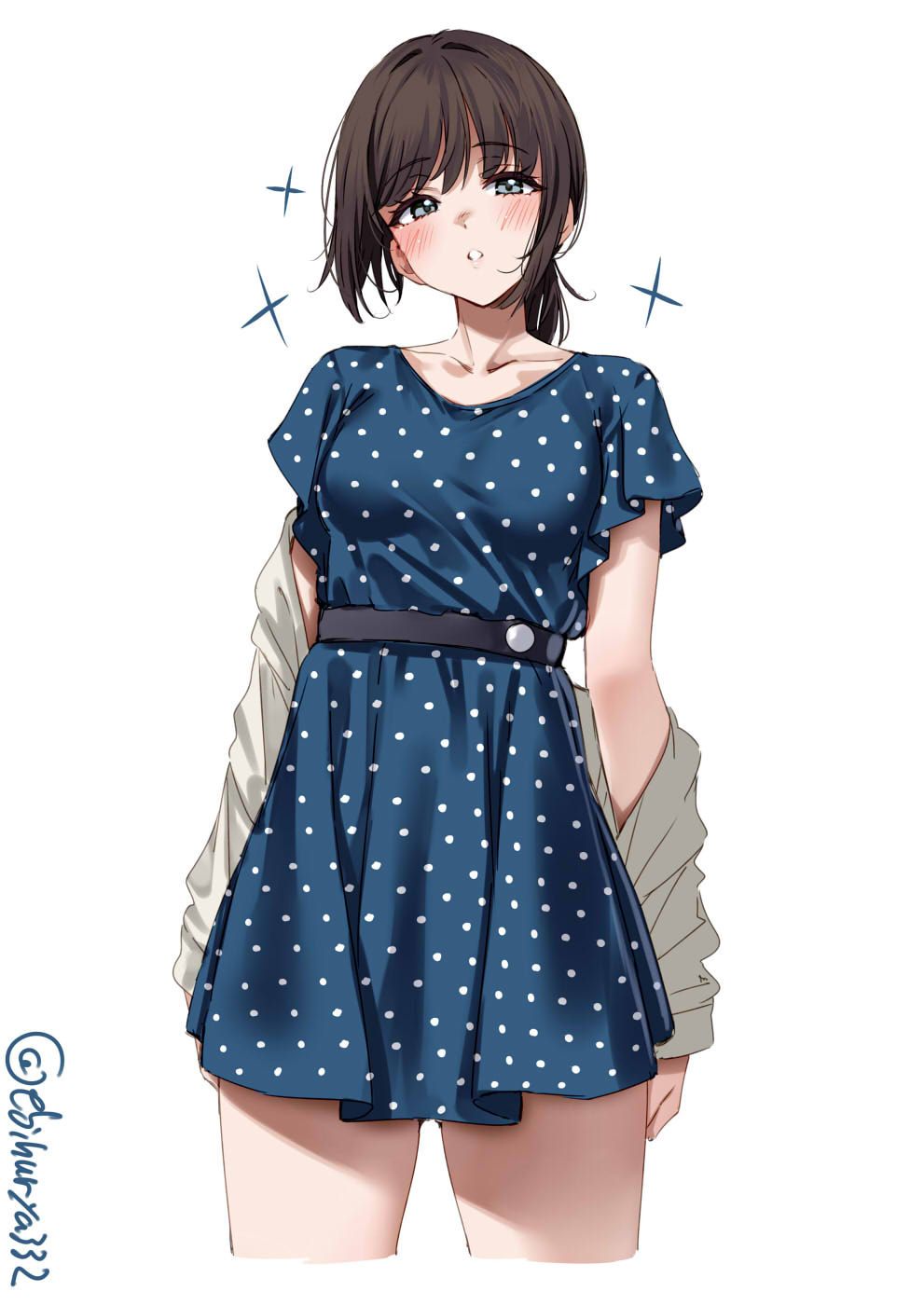 1girlalternate breast size (larger)artist namebeltblack beltblue dressblushbreastsbrown haircollarbonecropped legsdresshair between eyeshair intakeslong sleeveslooking at viewermedium breastsmedium hairone-hour drawing challengeparted lipspolka dotpolka dot dressshort sleevessidelockssimple backgroundsolothighstwitter usernamewhite background