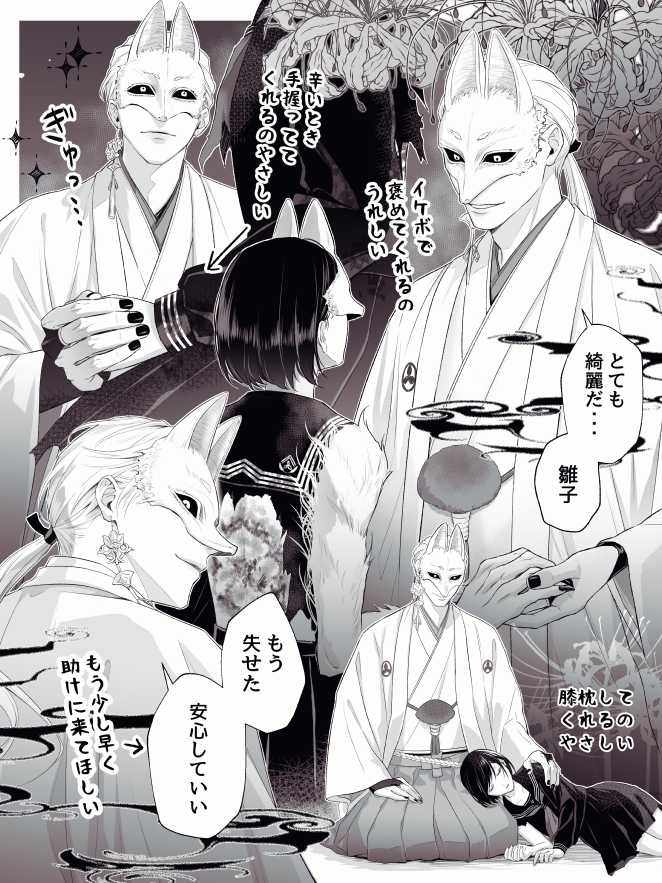 1boy1girlblack hairblack nailsblack sailor collarblack sclerablack serafukublack shirtbridal gauntletsclosed eyescolored scleraearringsflowerfox maskhakamahand on another's shoulderheteroholding handsjapanese clothesjewelrykneelinglap pillowlong hairlow ponytailmaskparted lipsponytailrobesailor collarschool uniformserafukushirtshort hairsingle earringsleepingslit pupilssmilespider lilytasseltassel earringstorn clothestorn sleeveswhite hairwhite robe